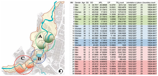 In order to test the validity of the software, it was utilized in a real project related to the urban structure of the Gelal River route in the city of Khorramabad, to assess the validity of AMMA. For this purpose, 30 mental map questionnaires were distributed in three areas as different ages and genders randomly (A, B and C) and each region was divided into two sections (Figure 9). Part A is located in the northern part of the city and covers the area between the Sakhrei and the QUE parks. This area is considered as a recreational area for the leisure time of Khorramabad residents. Part B is located in the central part of the city between the Shohada Bridge and Daraei Bridge and is considered a part of the city’s busy and crowded area. Part C is located in the southern part of the city, which is considered as the historical area of Khorramabad. Ghaleh Falak al-Falak, which is 1300 years old, and Safavi Bridge, which is about 300 years old, are located in this area. This section includes the area between Hajji Bridge and Safavid Bridge.
