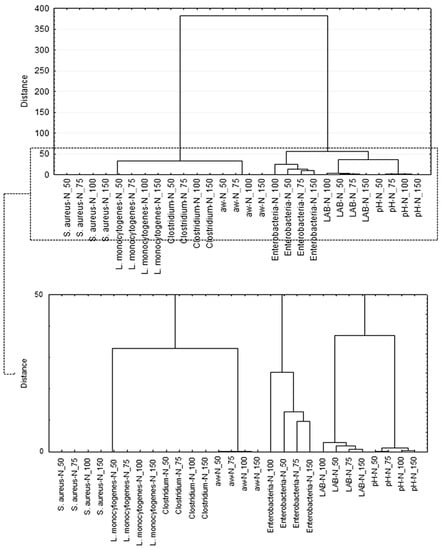 Cluster analysis dendrogram of the product safety factors (bacteria: S—Staphylococcus, L—Listeria, LAB—lactic acid bacteria, pH value, water activity aw; sample: N_150—control with 150 mg/kg of sodium nitrite; N_100—sample with 100 mg/kg of sodium nitrite; N_75—sample with 75 mg/kg of sodium nitrite; N_50—sample with 50 mg/kg of sodium nitrite).