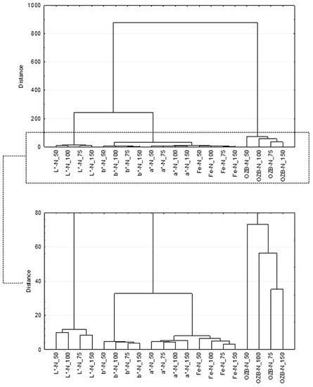 Cluster analysis dendrogram of the product color parameters (lightness L*, redness a*, yellowness b*, heme iron Fe, total heme pigment OZB; sample: N_150—control with 150 mg/kg of sodium nitrite; N_100—sample with 100 mg/kg of sodium nitrite; N_75—sample with 75 mg/kg of sodium nitrite; N_50—sample with 50 mg/kg of sodium nitrite).