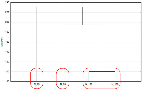 Cluster analysis dendrogram of different sodium nitrite addition (Sample: N_150—control with 150 mg/kg of sodium nitrite; N_100—sample with 100 mg/kg of sodium nitrite; N_75—sample with 75 mg/kg of sodium nitrite; N_50—sample with 50 mg/kg of sodium nitrite)
