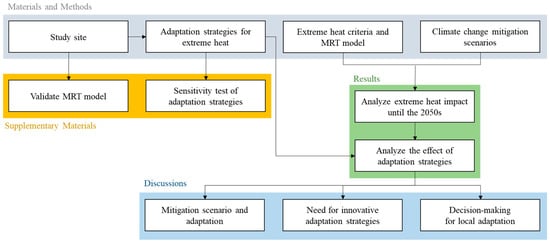This study considered the impact of extreme heat under two future scenarios and the effects of diverse adaptation strategies in an urban street setting. Figure 1 shows the research flow. First, we reviewed the urban extreme heat strategies of local plans related to the study site and the climate change scenario. Then, we analyzed the future impacts and offset effects of adaptation strategies using parameters related to mortality as the criteria for the extreme heat assessment. Before the main analysis, we compared MRT model results with the measured results from the study site and performed sensitivity tests of the adaptation strategies to validate the MRT model and the selected strategies.