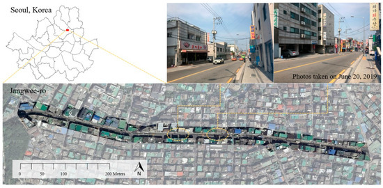 Map and photos of the study site, Jangwee-ro, a 755-m-long street in Seoul, Korea.