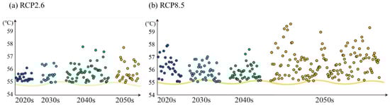 Daily maximum MRT exceeding 55 °C under (a) RCP2.6 and (b) RCP8.5. Each circle represents a day, and the colors represent each decade (dark blue: 2020s, light blue: 2030s, green: 2040s, yellow: 2050s).