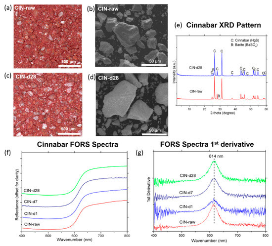 (a) Photomicrograph of the cinnabar (CIN)-raw sample; (b) secondary electron (SE) micrographs of the CIN-raw sample; (c) DM (Digital Micrograph) photomicrograph of the sample CIN-d28; (d) SE micrographs of the sample CIN-d28; (e) XRD pattern of CIN-raw and CIN-d28 ; (f) FORS spectra of cinnabar: CIN-raw, CIN-d1, CIN-d7, CIN-d28; (g) first derivative of the FORS spectra in (f). The intensity values of each XRD pattern, FORS spectra, and its first derivative plots were normalized and offset for comparison purposes.