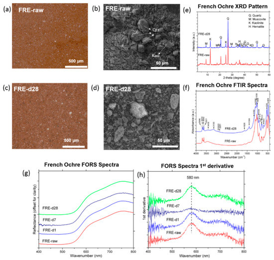 (a) Photomicrograph of the French ochre (FRE)-raw sample; (b) micrographs of the FRE-raw. Qtz stands for quartz and Kao stands for kaolinite; (c) photomicrograph of the sample FRE-d28; (d) micrographs of the FRE-d28; (e) XRD pattern of the samples FRE-raw and FRE-d28; (f) FTIR spectra of the FRE-raw, FRE-d1, and FRE-d28 samples; (g) FORS spectra of the French ochre samples FRE-raw, FRE-d1, FRE-d7, FRE-d28; (h) first derivative of the FORS spectra in (g). The intensity values of each XRD pattern, FORS spectra, and its first derivative plots were normalized and offset for comparison purposes.