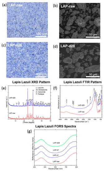 (a–b) Micrographs of the lapis lazuli pigment (LAP)-raw sample; (c–d) micrographs of the sample LAP-d28; (e) XRD pattern of the samples LAP-raw, LAP-d28; (f) FTIR spectra of the LAP-raw and LAP-d28 samples; (g) FORS spectra of the samples LAP-raw, LAP-d1, LAP-d7, LAP-d28. The intensity values of each XRD pattern and FORS spectra were normalized and offset for comparison purposes.