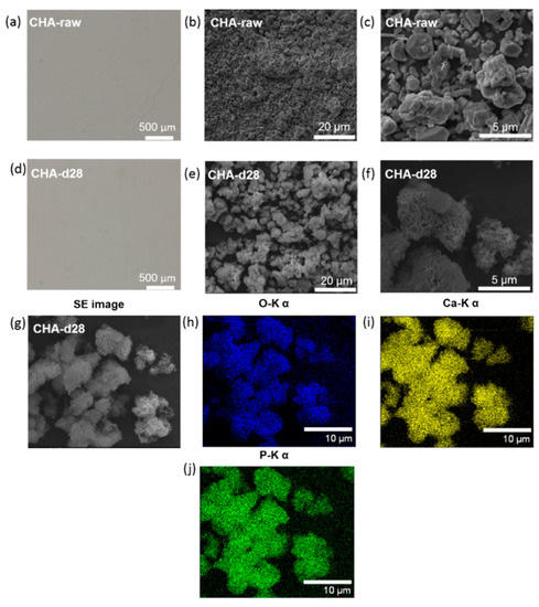 (a) Photomicrograph of the chalk (CHA)-raw sample; (b–c) micrographs of the CHA-raw sample; (d) photomicrograph of the sample CHA-d28; (e–f) micrographs of the CHA-d28 sample; (g–j) SE image and elemental mapping of the sample CHA-d28.