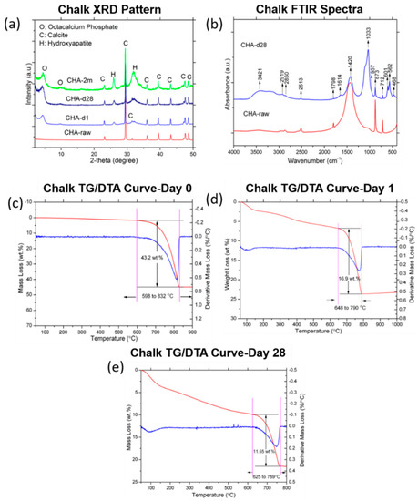 XRD analysis (Figure 5a) showed that the raw chalk pigment solely consisted of calcium carbonate (or calcite), while after 1 day and 28 days of immersion in DAP, some unreacted calcite, hydroxyapatite, and OCP were found to coexist. The consumption of calcite was not complete. FTIR analysis (Figure 5b) further confirmed the XRD results [65]. CaCO3 yielded bands at 712 cm−1 (ν4 in-plane bending vibration of CO32−), 873 cm−1 (ν2 out-of-plane bending vibration of CO32−), 1420 cm−1 (ν3 asymmetric stretching vibration of CO32−), and combination bands at 2513 cm−1 and 1798 cm−1. In the sample CHA-d28, bands appeared at 468 cm−1 (ν2 bending mode of O–P–O bond), 562 cm−1 (ν4 bending mode of O–P–O bond), 601 cm−1 (ν4 bending mode of O–P–O bond), 957 cm−1 (ν1 symmetric stretching mode of P–O bond), and 1033 cm−1 (ν3 asymmetric stretching mode of P–O). These are the vibration modes associated with the phosphate group present in HAP and OCP. [66]. The fraction of unreacted calcite was further estimated through TGA analysis, with a weight loss recorded between 600 and 860 °C linked to the decomposition of calcite. Weight losses of 43.2 wt %, 16.9 wt %, and 11.55 wt % were observed for the samples CHA-raw, CHA-d1, and CHA-d28, respectively (Figure 5c–e). This roughly corresponded to calcite fractions of 98.2 wt %, 38.4 wt %, and 26.25 wt %, respectively. Most of the calcite was consumed on the first day of reaction with DAP.