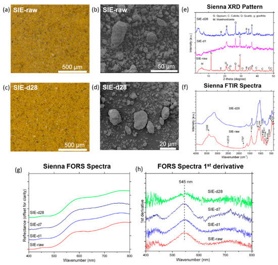 (a–b) Micrographs of the raw sienna pigment (SIE)-raw sample; (c–d) micrographs of the sample SIE-d28; (e) XRD pattern of the sample SIE-raw, SIE-d1, SIE-d28; (f) FTIR spectra of the SIE-raw and SIE-d28 samples; (g) FORS spectra of the samples SIE-raw, SIE-d1, SIE-d7, SIE-d28; (h) first derivative of the FORS spectra in (g). The intensity values of each XRD pattern, FORS spectra, and its first derivative plots were normalized and offset for comparison purposes.