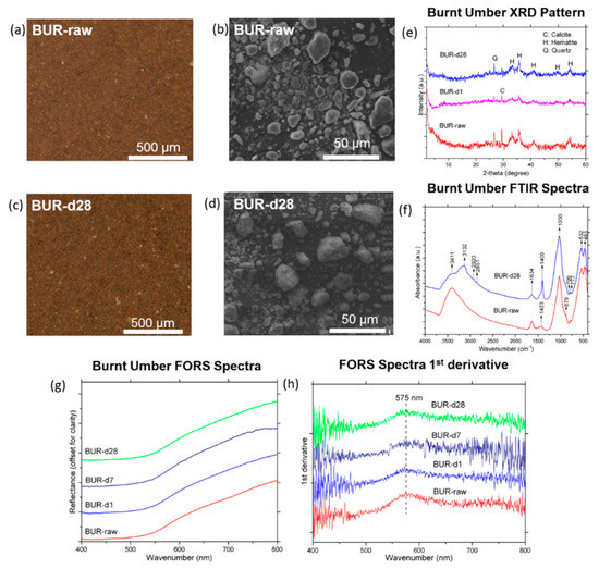 (a–b) Micrographs of the burnt umber pigment (BUR)-raw sample; (c–d) micrographs of the sample BUR-d28; (e) XRD pattern of the sample BUR-raw, BUR-d1, BUR-d28; (f) FTIR spectra of the BUR-raw and BUR-d28 samples; (g) FORS spectra of the samples BUR-raw, BUR-d1, BUR-d7, BUR-d28; (h) first derivative of the FORS spectra in (g). The intensity values of each XRD pattern, FORS spectra, and its first derivative plots were normalized and offset for comparison purposes.