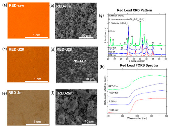 (a) Photomicrograph of the red lead (RED)-raw sample; (b) micrographs of the RED-raw; (c) photomicrograph of the sample RED-d28; (d) micrographs of the sample RED-d28, the elongated particle was identified as lead hydroxyapatite (Pb–HAP) by EDS point analysis; (e) photomicrograph of the sample RED-2m; (f) micrographs of the sample RED-2m; (g) XRD pattern of the samples RED-raw to RED-2m between 2θ of 20–38°; (h) FORS spectra of the samples RED-raw, RED-d1, RED-d7, RED-d28. The intensity values of each XRD pattern and FORS spectra were normalized and offset for comparison purposes.