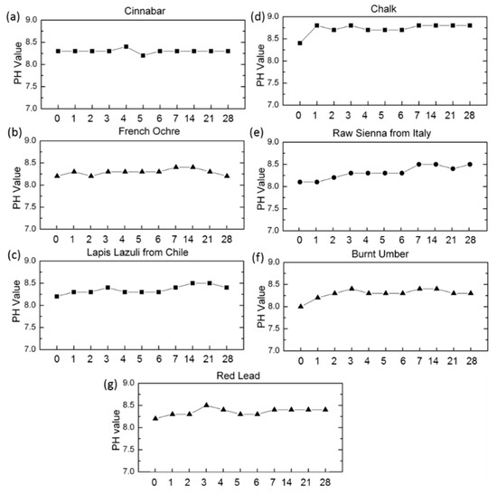 The pH value of the French ochre, lapis lazuli, and cinnabar remained almost constant (~8.3) during the first 28 days of reaction. This is consistent with the fact that no significant color, phase, or morphological changes could be observed in these pigments upon exposure to the DAP solution.