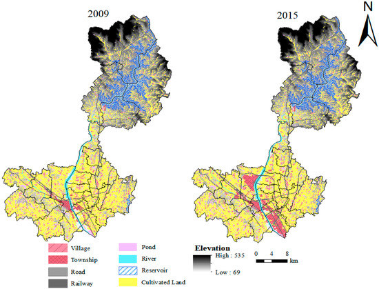 The land use data of Lishan Town, Suizhou City, Hubei Province, in 2009 and 2015 was derived from the Suizhou Land Use Change Survey Database, which was provided by the Suizhou Land and Resources Bureau Information Center. In data processing, the analysis tools of ArcGIS 10.2 software (ESRI, 380 New York Street, Redlands, CA, USA) were used to extract the layers of cultivated land, villages, roads and water system elements in Lishan Town in 2009 and 2015, and then the spatial connection tool was used to associate the cultivated land elements with the administrative village vector diagrams. The digital elevation model (DEM) data (30 × 30 m) was downloaded from the Geospatial Data Cloud website (http://www.gscloud.cn/) for analysis of the elevation and slope of Lishan Town. These provide effective data support for the research in this paper.