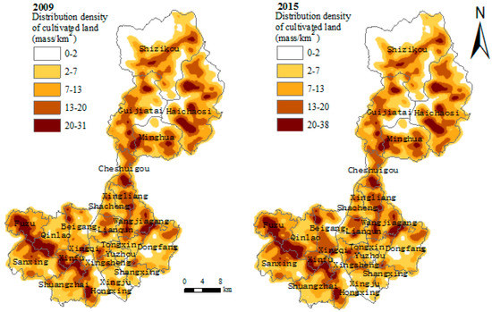 Spatial distribution of kernel density values of cultivated land in Lishan Town in 2009 and 2015.