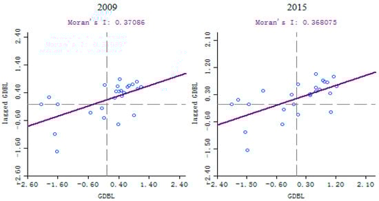 From the perspective of global spatial autocorrelation analysis, the cultivated land of Lishan Town has a strong agglomeration distribution in space. However, considering the spatial distribution of the kernel density values of cultivated land determined above, the distribution of cultivated land in each administrative village still exhibits obvious differences. By using the local spatial autocorrelation statistics, it is possible to more accurately analyze the internal differences in the spatial autocorrelation levels of the cultivated land area of each administrative village in Lishan Town. The Geoda software was used to map the spatial autocorrelation Moran’s I scatter plot corresponding to the proportion of cultivated land in each administrative village of Lishan Town in 2009 and 2015 (Figure 4).
