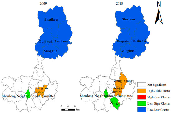 LISA agglomeration of cultivated land in administrative village of Lishan town in 2009 and 2015.
