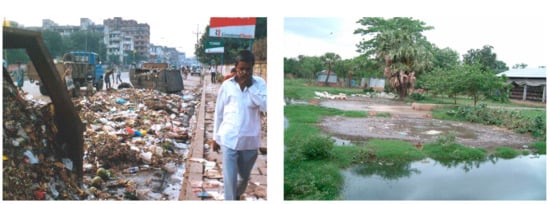 - Dhaka City Corporation. Dhaka City State of Environment Report; Dhaka City Corporation: Dhaka, Bangladesh, 2004. [Google Scholar]