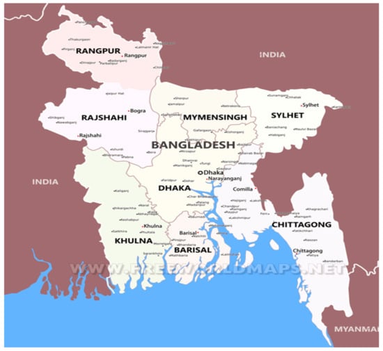- Free World Map. Bangladesh Political Map. 2018. Available online: http://www.freeworldmaps.net/asia/bangladesh/political.html (accessed on 5 May 2018).