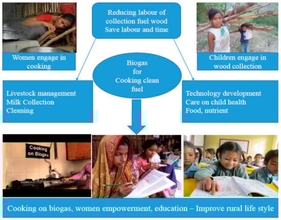 Rural biogas extension programmes have a number of beneficial impacts related to positive motivation through work time saved. This provides major benefits to rural families, bringing them closer to meeting the UN’s SDGs in terms of economic, environmental, health, social and cultural aspects of national development. These benefits are recognised by rural people in Bangladesh and this has motivated them to purchase biogas plants. The survey results presented demonstrate an average time saving of 1 h 43 min a day for women using a biogas plant. A community-based biogas plant has a significant impact upon rural community development through increasing child education and women empowerment. The time saved (through reduced time for cooking meals, reduced collection of firewood and less cleaning of cooking vessels) can be used to improve the education of women and children. There are also significant health benefits to be accrued if biogas replaces cooking using wood fuel, such as irritation to eyes, nose and the respiratory system. Furthermore, the benefits extend to the wider environment: by reducing the need to collect wood fuel the rate of deforestation also reduces, thus giving an opportunity for biodiversity to recover. Biogas stoves are more efficient than wood fires, so the amount of CO2 released is also reduced. Therefore, the implementation of rural bioenergy could help in realising a number of SDGs (such as SDG 3, 4, 5 and 7).