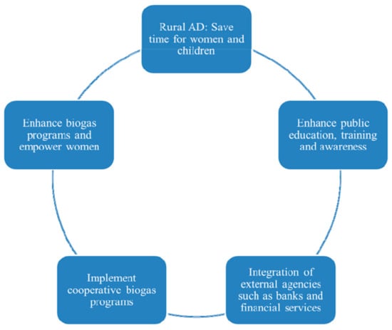 Proper utilization of the benefits from AD (e.g., energy and fertilizer production) can contribute to the further development of the rural community. Acquiring these benefits involves management of the technology through community ownership, capacity building and training/competence development [81]. In turn, this will ensure livelihood improvement and simultaneously engage rural women in development activities. Concomitant benefits include improved maternal health and reduction in child mortality because women have less arduous work to do and can devote more time to their families and/or fund childcare support. This eventually helps to reduce poverty and therefore works towards satisfying the UN’s MDGs and SDGs. Enhancing rural biogas programmes saves labour time and provides children and women with opportunities to pursue education, thus improving social equity within a community (refer to the conceptual model represented in Figure 5). Integration of an external agency, bank and/or micro-finance organisation can help to facilitate the implementation of a community-based AD program (as an iterative chain of events)–further increasing women’s empowerment (Figure 6). First and foremost, education provides a gateway for rural communities to seek training in areas such as microcredit to encourage the development of small AD projects. Various rural development programmes in Bangladesh (administered by groups such as Grameen Shakti) have already recognised these benefits [82]. Continuation of this trend is essential for developing further the implementation of a biomass and bioenergy program within rural communities.