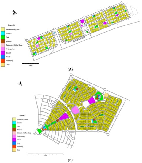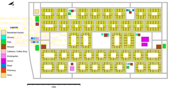 Developed in 2002, this neighborhood occupies a rectangular-shaped lot of about 1230 m × 2280 m with a gross area of about 285 hectares. It contains 460 plots for two-story single-family housing with a total population of 3312 people and a gross population density of only 11.02 pph. The urban form of this neighborhood was conceptualized as clusters of 10, 12, 14, and 16 housing plots grouped around communal open spaces. The house plot area is either a 45 m × 60 m or 45 m × 45 m. Meanwhile, the main services and amenities, such as mosques, schools, a clinic, and retail shops, were located on both the longitudinal center of the neighborhood and on its outer edges. The neighborhood was conventionally designed as a “self-contained” community providing the envisaged services and amenities of residents; however, not all the planned amenities have been provided, most likely due to the low population density. The FAR of the neighborhood is only 0.11, which reflects a low urban compactness ratio that resulted from the adopted sprawling urban form of the neighborhood.