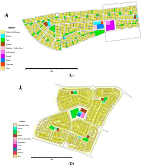 Case Study 3, N4-Al Ghreiba neighborhood in Al Ain is the first Emirati housing project designed to achieve the second level (2 pearls) in the Estidama (meaning sustainability in Arabic) building and community rating systems in the Abu Dhabi Emirate [28]. Its site is located approximately 10 km south-west of Al Ain city center and is zoned as a “low-density villa residential” under the future Plan Al Ain 2030 [29]. To resonate with traditional Emirati neighborhoods, known as fareej, pocket parks represented the baraha (traditional small open space), while linear parks represented the sikka (traditional name for a 2 m to 6 m wide linear pedestrian access). The neighborhood consists of 636 single-family housing plots on a 139.96-hectares site with a total population of 4579 people. The gross population density is 32.72 pph. The neighborhood contains only two-story single-family homes with two different built up areas of 500 m2 and 420 m2. In response to the desire for achieving a more compact urban form, the housing plot area has significantly decreased to only 30 m x 36 m with a higher FAR of 0.26. The street pattern is mostly orthogonal with some curvilinear streets in the lower left side. The plots alternate between a back-to-back arrangement and clustering around pocket parks (Figure 2C).