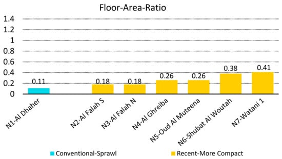 All these new neighborhoods incorporated a more compact design than the sprawl of conventionally designed neighbourhoods, for example, Al Dhaher with its low FAR of 0.11. However, the compaction ratios varied greatly among the six neighborhoods, as they ranged from 0.18 for N2 and N3 (Al Falah South and Al Falah North neighborhoods) up to 0.41 in N7 (Watani 1 neighborhood) (Figure 3).