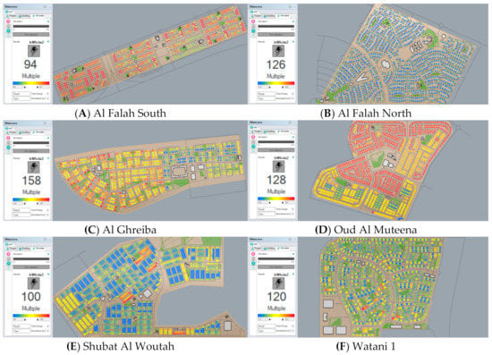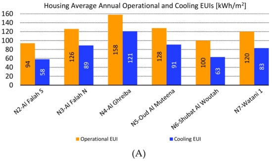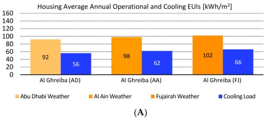 In this experiment, the N4-Al Ghreibah neighborhood was simulated under three different climate zones for the four cities of Abu Dhabi, Dubai, Al Ain, and Al Fujairah. The climate of Dubai is similar to Abu Dhabi, so the same weather file was used for the neighborhoods in Dubai and Abu Dhabi. As shown in Table 11 and Figure 9A–C, climate zone seems to have a slight impact on the average housing operational and cooling EUIs. The effect of the weather conditions in Abu Dhabi and Dubai on the average housing operational EUI was slightly better than that of Al Ain (92 vs. 98 kWh/m2/y), and the effect of weather conditions in Al Ain was slightly better than that of Al Fujairah (98 vs. 102 kWh/m2/y). The same pattern was observed for the average cooling EUI, where Al Ain recorded 62 kWh/m2/y on average and Abu Dhabi/Dubai recorded 56 kWh/m2/y on average, while Al Fujairah recorded 66 kWh/m2/y on average. This means that the climate of different UAE cities, depending on their geographical locations, may have a slight impact on the average housing operational and cooling EUIs of residential neighborhoods.