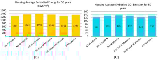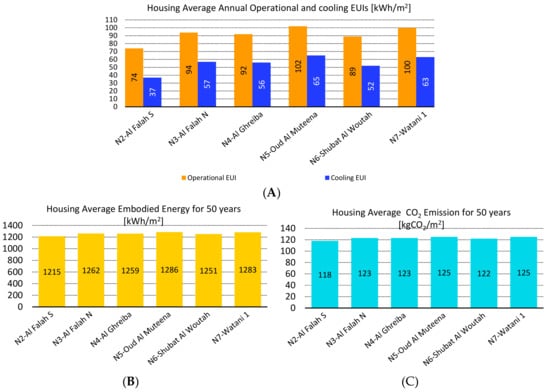 (A) Average housing annual operational and cooling EUIs for the six case studies; (B,C) Average housing embodied energy for 50 years (B), and CO2 emission for 50 years (C) for the six case studies.