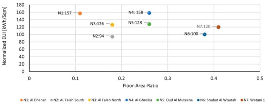 The correlation between the FAR and the operational EUI for housing in the studied neighborhoods (Figure 6) revealed that increasing compaction (FAR) did not necessarily decrease the operational EUI as expected. Increasing the FAR to 0.26 in N4, Al Ghreiba neighborhood showed nearly the same operational EUI as the conventional urban sprawl of N1-Al Dhaher neighborhood, with its very low FAR of 0.11. Meanwhile, N5-Oud Al Muteena neighborhood, with the same FAR of 0.26, achieved a decreased operational EUI of 128 kwh/m2. In addition, the most compact neighborhood of N7-Watani 1, with a FAR of 0.41, did not have the lowest operational EUI value (116 kwh/m2), while other less compact neighborhoods—N6-Shubat Al Woutah and N2-Al Falah South, with FARs of 0.38 and 0.18, respectively—had lower operational EUI values of 100 and 96 kwh/m2. The best-performing neighborhood was N2-Al Falah South, with an operational EUI of 96 kwh/m2, while its FAR was just 0.18.
