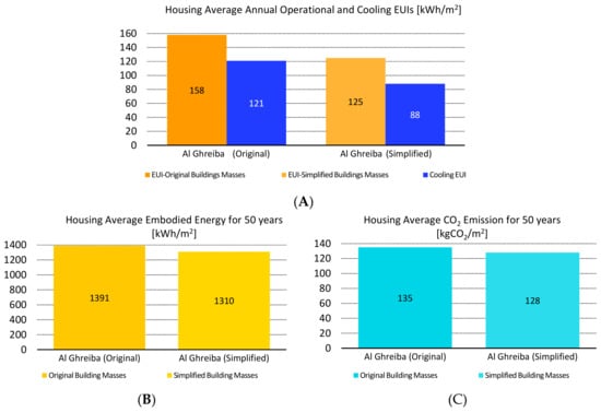 For the simplified building form, the housing operational EUI decreased from 158 to 125 kWh/m2/y on average, while the cooling energy decreased from 121 to 88 kWh/m2/y on average. The same trend appeared for the average embodied energy and the CO2 emissions for 50 years, as shown in Table 10 and Figure 8B,C. This means that the simpler the buildings mass geometry is, the lower average operational and cooling EUIs are.