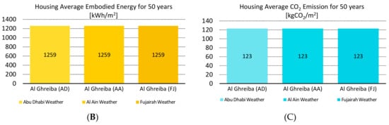 (A). Experiment 4—average housing annual operational and cooling EUIs. Experiment 4—average housing embodied energy for 50 years (B), and average housing CO2 emission for 50 years (C).