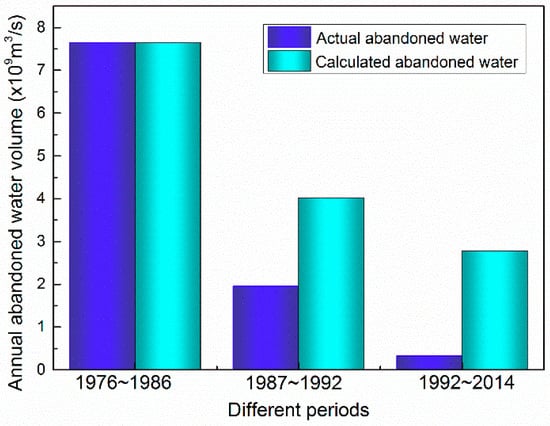 Comparison of the actual and calculated abandoned water of the Liujiaxia reservoir in different periods: (1) 1976~1986, before the impoundment of the Longyangxia reservoir; (2) 1987~1992, before the completion of the Longyangxia reservoir; and (3) 1992~2014, after the operation of the Longyangxia reservoir.