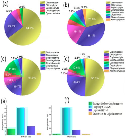Genera composition of the phytoplankton in different water areas: (a) in the river reach upstream from the Longyangxia reservoir; (b) in the Longyangxia reservoir; (c) in the Liujiaxia reservoir; and (d) in the river reach downstream from the Liujiaxia reservoir. (e) The average density in different areas; and (f) the average biomass in different areas.