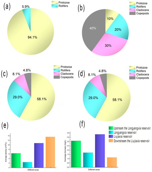 Genera composition of the zooplankton in different water areas: (a) in the river reach upstream from the Longyangxia reservoir; (b) in the Longyangxia reservoir; (c) in the Liujiaxia reservoir; and (d) in the river reach downstream from the Liujiaxia reservoir. (e) The average density in different areas; and (f) the average biomass in different areas.