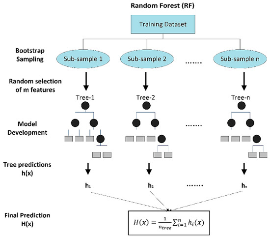 Random forest (RF) model is considered as an ensemble learning technique at which the prediction is dependent on a group of trees [22]. Unlike regression tree, which depends on the individual tree structure, the final prediction result in RF is based on a voting mechanism where each decision tree in the forest has a vote, and the final prediction is the average of votes as presented in Equation (1).
