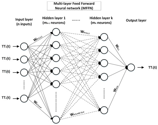 where is the target link travel time estimation during the time interval , is the weight connecting the hidden neuron in the third hidden layer with the output neuron, is the value of the hidden neuron in the third hidden layer during the time interval , is the output neuron bias, and is the transfer function. The models of the neural network were developed using the MATLAB.