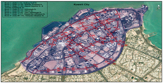 The urban road network of Kuwait City in the State of Kuwait, shown in Figure 3, is considered in this study. Kuwait City, the capital of Kuwait, is a central business district with considerable congestion during the peak hours. Kuwait City is a typical urban road network of two-way roads and signalized intersections at most of the intersections. The free flow speed on the links ranges from 60 to 80 km/h. A calibrated Vissim model of Kuwait City [11] is used to test different scenarios in this study. The Vissim model includes 100 links in Kuwait City, which are considered in the analysis.