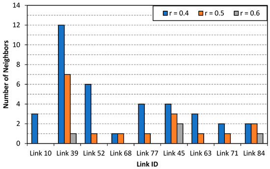 In this study, link neighbors were identified using Pearson correlation. Travel time correlations were computed between the 100 links in Kuwait City network using the simulated travel time data. Only links with similar characteristics, located within the same area type, and have similar vehicle entry/exit movement directions were considered in the analysis. Therefore, travel time correlations only between 71 links were computed. Figure 4 presents the spatial travel time correlation between the links in the Kuwait City network. A correlation cut-off value of 0.4 was used to identify link neighbors. In total 592 link neighbors were identified for the 71 links with an average of 8 neighbors per link. Each link has at least one neighbor (except for 13 links, 18% of all links, were no neighbors were identified), with a maximum of 25 neighbors. In this study, nine links (link IDs 10, 39, 52, 68, 77, 45, 63, 71, 84) were randomly chosen from the network for the estimation of the travel times. Figure 5 shows the number of link neighbors identified for the nine links across different spatial correlation value.