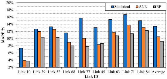In this study, travel time estimation models were developed for the selected nine links—e.g., link ID 10, 39, 52, 68, 77, 45, 63, 71, and 84. The developed models relate link travel times with link neighbors. For the selected nine links, 37 link neighbors were identified at a correlation cut-off value of 0.4. Three different types of travel time estimation models—e.g., artificial neural network (ANN), random forest (RF), and statistical models—were developed. The models were developed using the training dataset, while the models’ performance was evaluated using the testing dataset.