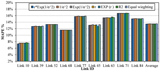 For the statistical models, different regression models including the linear, power, exponential, and logarithmic that relate link travel times with each of its neighbor were developed. For the nine links considered in the analysis, 37 regression models were developed and only models with significant explanatory variables at p-value < 0.05 were considered. Linear regression models show a better fit than the power, exponential, and logarithmic models. The developed regression models were combined in a single mode for each link using the weighting schemes presented in Table 1. The weights , and (1−) for the real time estimation and the average historical travel time were estimated for each link during each period . The best estimate for each link travel times during each interval was estimated. The performance of the statistical model is presented in Figure 6. Moreover, a sensitivity analysis was conducted to investigate the impact of the applied weighting schemes on the model performance, as shown in Figure 7. The results show that the accuracy of the statistical models is insensitive to the applied weighting schemes. As such, the combined weighting scheme of the correlation coefficient and models’ variances are used in the development of the statistical models later in the paper. The results show that the average estimation error for the nine links ranges between 7.6% and 16.7% with an average of 13.4%.