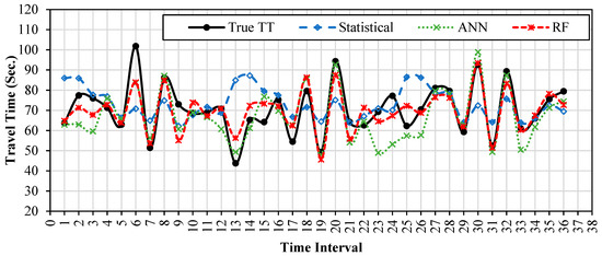 The results show that the average estimation error of the RF model for the nine links ranges between 3.7% and 12.3% with an average of 9.3%. Both the RF and ANN models show improvements in estimation performance compared with the statistical model. For the nine links, the average improvement in the estimation accuracy when the RF is adopted ranges between 2.3% and 7.9% with an average of 4.2% compared with the statistical model. The performance of the RF was slightly better compared with the ANN model. The average improvement in the estimation accuracy when the RF model is adopted is 1.3% with a maximum improvement of 2.4% compared with the ANN model. An example of travel time model estimation for link ID 77 is presented in Figure 8.