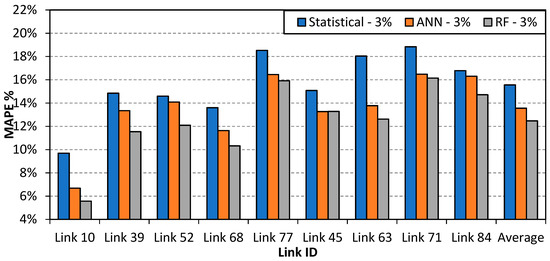 For the neural network model, multi-layer feed forward neural networks (MFFN) were developed for each link of the nine links considered in this study. The developed MFFN nets were trained using the training dataset. In the training process, the training dataset was split into two sets—e.g., training set and validation-training set which consist of around 85% and 15% of the training dataset, respectively. The validation-training dataset is used as stopping criteria for the training to avoid overfitting. The input parameters to the neural networks are link neighbors travel times, while the output parameters are the predicted link travel times. Three dense hidden layers were developed in each neural network with 30 neurons in both of the first and second hidden layers and 15 neurons in the third hidden layer. During the training process, a comparison of the prediction accuracy of the neural networks, while considering their complexity in terms of the number of hidden layers and neurons in each layer is performed. Different number of hidden layers (e.g., 1, 2, and 3 hidden layer(s)) and different number of neurons in each layers (e.g., 5, 10, 15, 20, 25, 30, 35, and 40 neurons) with a different transform function for each layer (e.g., logistic sigmoid and tangent sigmoid) is considered. The analysis shows that using three hidden layers with 30 neurons in the first two hidden layers and 15 neurons in the third hidden layer with a logistic sigmoid transform function in the first two hidden layers and a tangent sigmoid in the third hidden layer and the output layer provided the best prediction accuracy. Therefore, this structure was used to build the MFFN nets in this study, except for link ID 68 where the tangent sigmoid transfer function in all layers provided the best accuracy. The testing dataset (unseen data) were used in the performance evaluation of the MFFN net models. The performance of the MFFN nets is presented in Figure 6. The results show that the average estimation error of the MFFN model for the nine links ranges between 3.9% and 13.8% with an average of 10.5%, which outperforms the estimation performance of the statistical model. Significant estimation improvements were observed for links ID 10, 68, 77, 45, 63, 71, and 84 compared with the statistical models estimation.