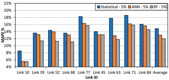 Random forest (RF) models and multi-layer feed forward neural networks (MFFN) were developed for the nine links considered in the analysis based on the available link neighbors during each time period . For the statistical models, the weighting scheme assigns a value of zero for the link neighbors not covered by probe vehicles during the time period —i.e., the estimation is only based on the available link neighbors on each time period . The performance of the three models at different probe penetration rates are presented in Figure 9, Figure 10 and Figure 11. The performance of the models was evaluated using the testing dataset. The results show that the RF and ANN models significantly outperform the statistical model, especially at a low probe penetration rate of 1%. The RF and the ANN models have a higher average estimation accuracy of about 4.7% and 3.5% compared with the statistical model at a probe penetration rate of 1%, respectively. At a probe penetration rate of 1%, the RF, MFFN, and the statistical models correctly estimate real time travel times with estimation accuracies of 85.6%, 84.4%, and 80.9% respectively. Moreover, the results show that the accuracy of the models increase as the probes’ penetration rates increase from 1% to 3%. However, beyond 3%, no significant increase in the estimation accuracy is observed compared to the penetration rate of 5%.