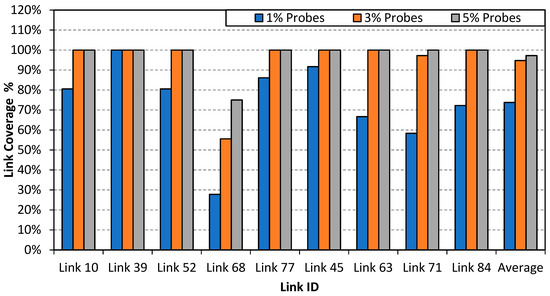 Furthermore, link coverage was evaluated at the three probe penetration rates. Link coverage was computed as the percentage of the number of intervals at which the real time travel times are available, for at least one link neighbor, during the total measurement periods. Figure 12 shows the average coverage of the link neighbors at the different probe penetration rates. The results show that the average coverage of the links reaches 73.8% at a probe penetration rate of 1%. However, the coverage of links significantly increases as the probe penetration rate increases to 3% and 5%. The average link coverage reaches about 94.8% and 97.2% at probes penetration rates of 3% and 5%, respectively.