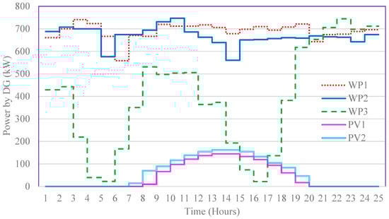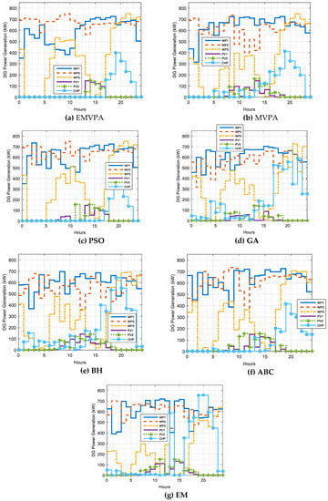 Figure 6 shows the optimal energy management among all DGs as optimized by the EMVPA, MVPA, PSO, GA, BH, ABC, and EM, over the course of 24 hours. Basically, these graphs indicate the power produced by each DG at a given hour. It can be noted that for all algorithms, the sum of power produced by all DGs equals the load demand, maintaining the load demand balance.