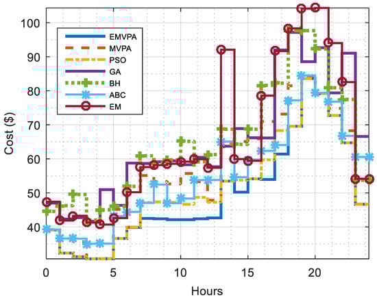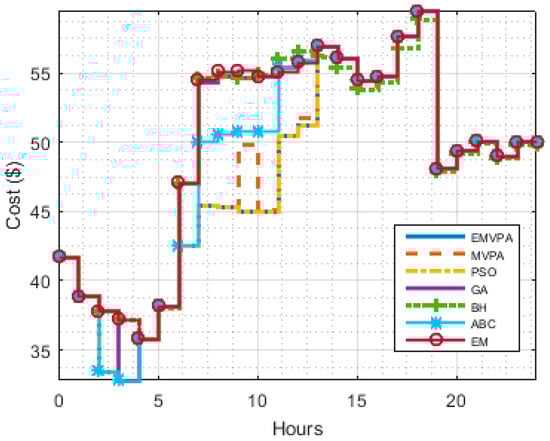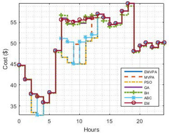 The total costs per hour obtained by the EMS using different algorithms are given in detail in Table 4 which are also illustrated in Figure 7. The last row of this table gives the total cost for 24 hours. Total cost obtained using the EMVPA is $1184.18, which is the lowest among the tested algorithms. The second-best algorithm for Case 1 is PSO which gives a total cost of $1230.709, while the third algorithm, the ABC, gives a total cost of $1323.594. It can also be seen from Table 4 that the EMVPA achieved better results at any hour, which gives the minimum cost of EEMS, being the best power system scheduling solution at any instant.