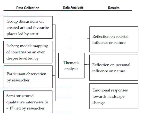 Our study was based on a close collaboration between an artist and an academic researcher on the topic of favourite places in public spaces. The art form used by the artist was social land art which sees itself as a link between art, society and science and entails a strong notion of participation [21]. The process of data collection was based on previous art workshops conducted by the artist. Problem framing and research questions were developed in close collaboration between the researcher and the artist. To address the overarching goal of uncovering emotional responses towards landscape change, the collection of empirical data followed a participatory qualitative research approach (Figure 1). Data was collected by the academic researcher in a setting organized by the artist. The project was structured as follows: Workshops were the core of the interactions starting with two-days in August 2017, one-day in September 2017, and a one-day closing workshop in February 2018. Between September 2017 and February 2018 all participants (excluding the artist) worked with and created art in their favourite public places (Figure 1, Figure A1 in Appendix A), which were visited and discussed on site at the closing workshop afterwards.