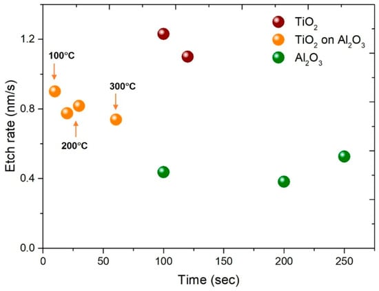 Figure 2 presents the dry etch rates of TiO2 and Al2O3 films as a function of the etch time and deposition temperature. TiO2 and Al2O3 single layers with a thickness of 200 nm were deposited at 200 °C without a post-deposition annealing step, and Figure 2 shows TiO2 layers on Al2O3 deposited at a deposition temperature of 100–300 °C. The selectivity for etching TiO2 over Al2O3 in CHF3 and Ar gas was not remarkable, compared to chemical etching. The dry etch rates of the TiO2 films on Al2O3 were approximately double those of Al2O3 in all samples deposited at different temperature ranges. The etch rates tended to decrease slightly with increasing TiO2 deposition temperature. In the case of a 200-nm-thick TiO2 single layer, the etch rates were 1.1–1.2 nm/s, which were higher than those of the 50 nm-thick TiO2 films on Al2O3. This is because the film density increases with an increasing number of deposition cycles during the ALD process, i.e., with increasing film thickness [20]. Therefore, thicker TiO2 films are more resistant than thinner films. The etch rate of the Al2O3 single layer was almost independent of the etch time.