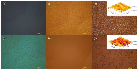Optical microscopy images of TiO2 layer deposited at (a,d) 200 °C, (b,e) 250 °C and (c,f) 300 °C on an amorphous Al2O3 layer: images (a–c) were obtained before etching and (d–f) after etching. The insets in (c) and (f) are AFM images used for the surface roughness measurements.